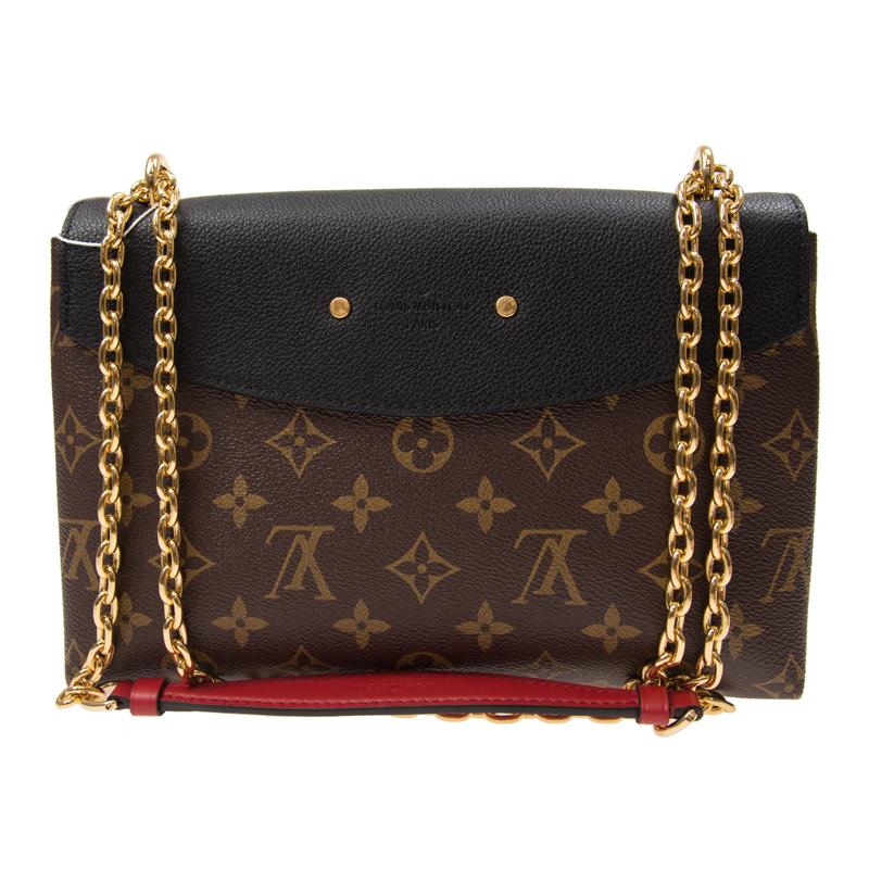 10.2 x 6.4 x 2.8 inchesMonogram coated canvas and cowhide leatherCowhide leather trimMicrofiber liningShiny gold color metallic piecesSliding multicarry (shoulder/cross shoulder) gold colored metal chainFlat leather shoulder piecegold colored metal lock with magnet closureInside smartphone pocketInside zipped pocket