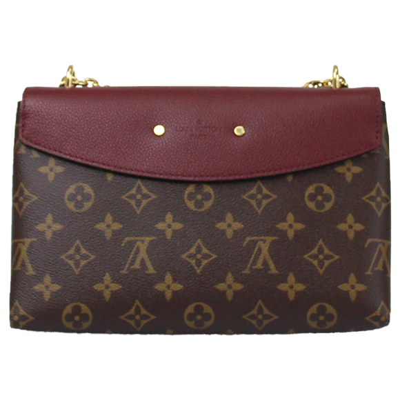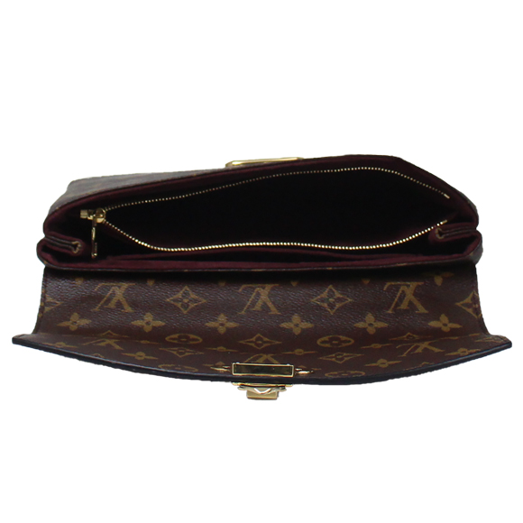 10.2 x 6.4 x 2.8 inchesMonogram coated canvas and cowhide leatherCowhide leather trimMicrofiber liningShiny gold color metallic piecesSliding multicarry (shoulder/cross shoulder) gold colored metal chainFlat leather shoulder piecegold colored metal lock with magnet closureInside smartphone pocketInside zipped pocket