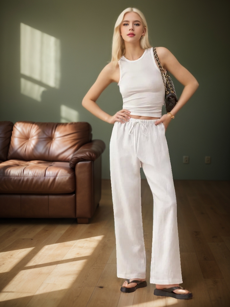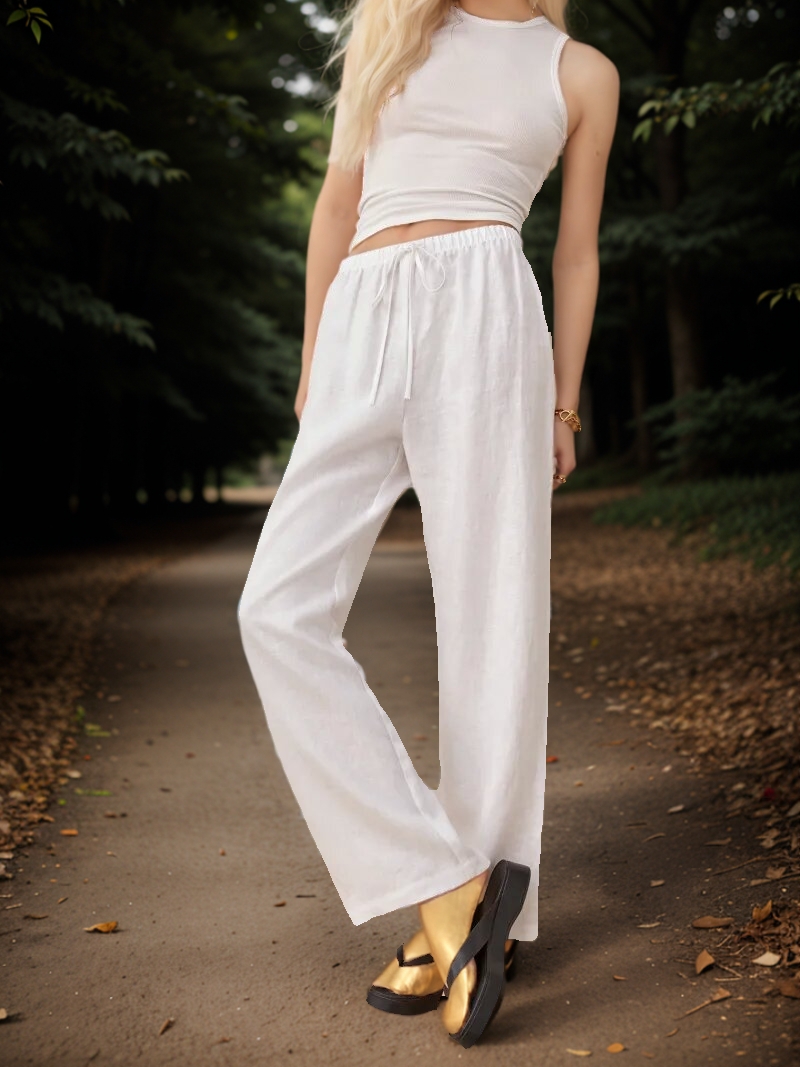 - The cut is superb, elongating the legs. White linen trousers with drawstring elastic waist, straight leg, reformation.