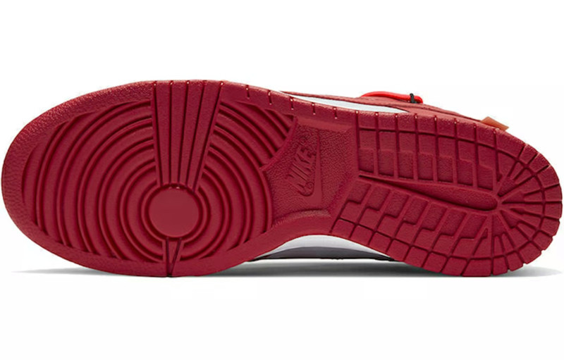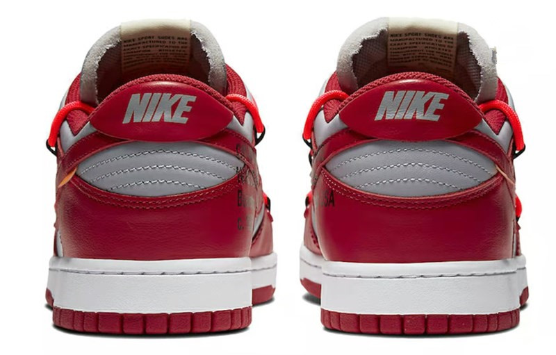 This Dunk Low is comprised of a wolf grey leather upper with university red overlays. A unique secondary lacing system, zip-ties, and signature Off-White text on the sides completes the design.